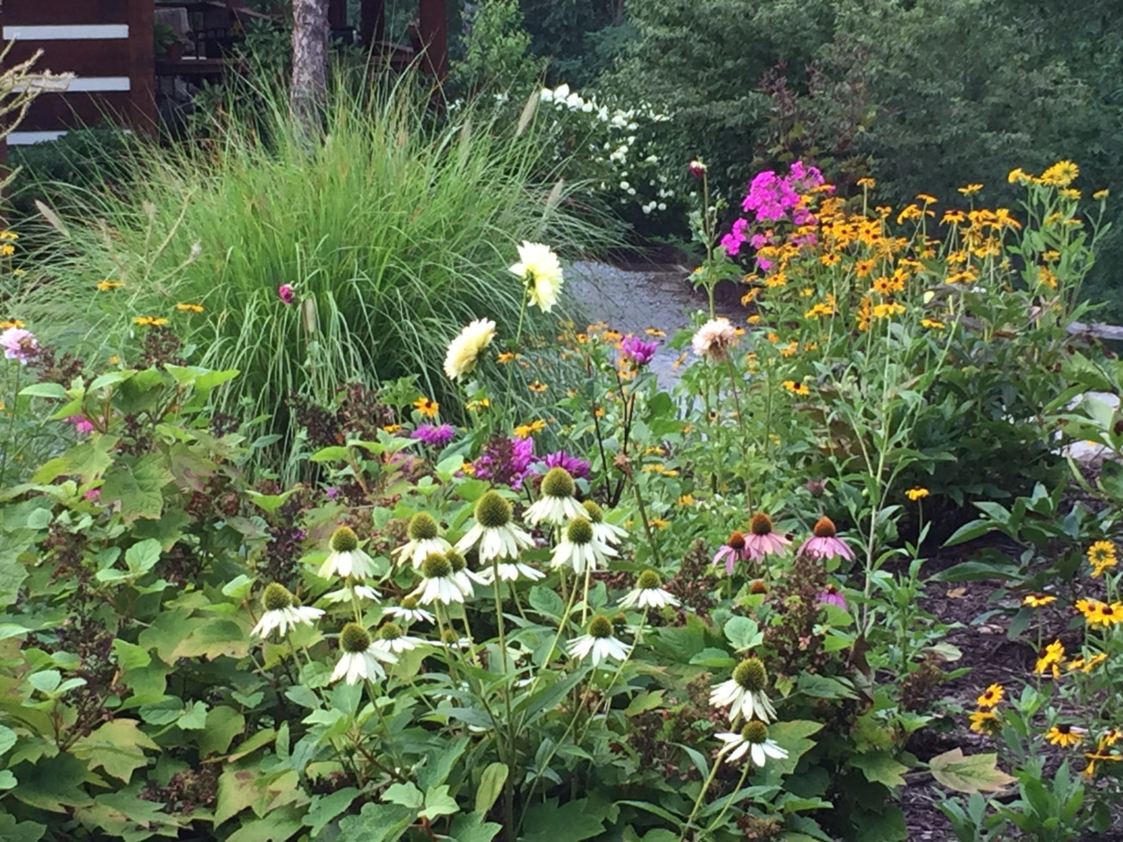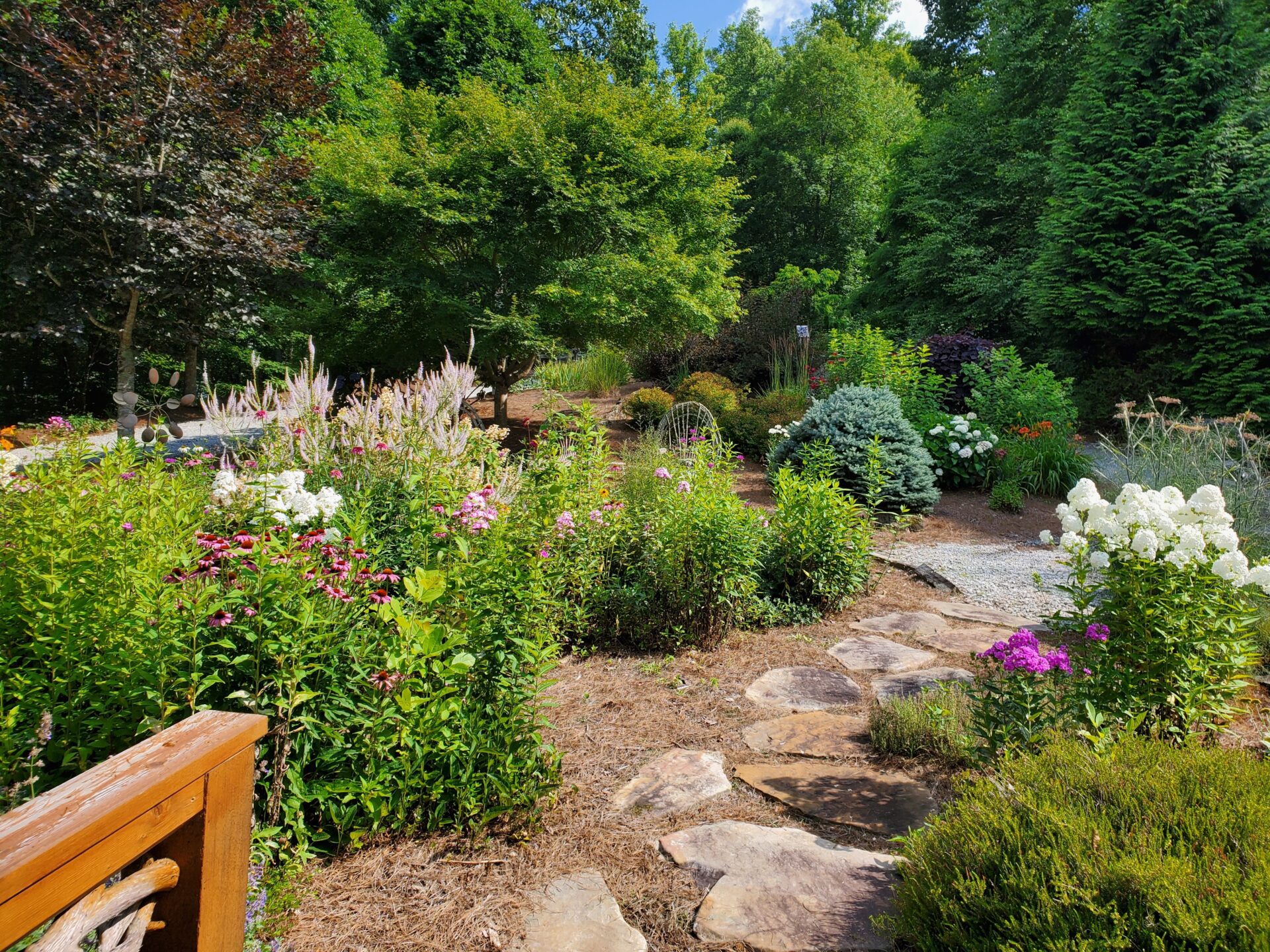 The gardens have been a labor of love since Margaret purchased the home in 2012. Today, they are filled with native plants that attract many pollinators. Whether you sit on one of the four decks or find a seat in the garden, the home is a great place to enjoy the views and the flowering trees and perennials.